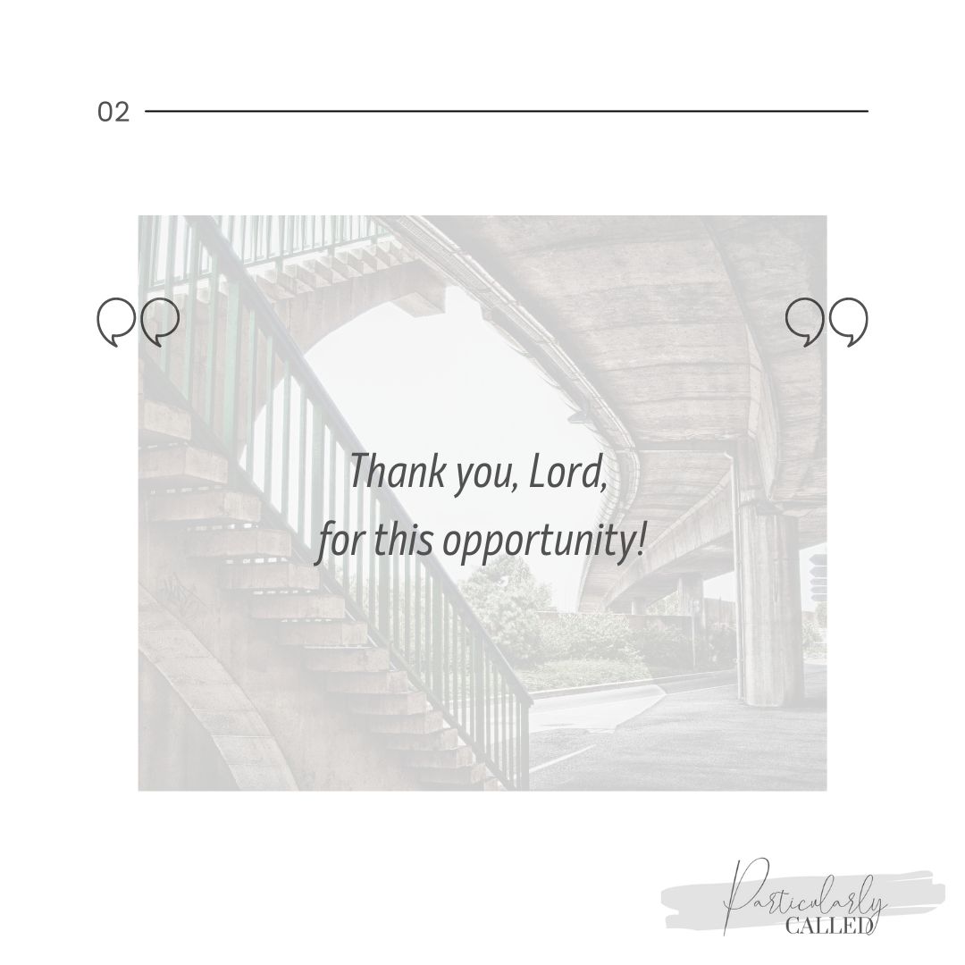 - Say: “Thank you, Lord, for this opportunity” – You can also add the purpose if you know what it is – ie: “Thank you, Jesus, for this opportunity to practice patience”. or “Thank you, God, for this new opportunity to love/grow/heal” . (Again, feel free to personalize these words, just understand the purpose)