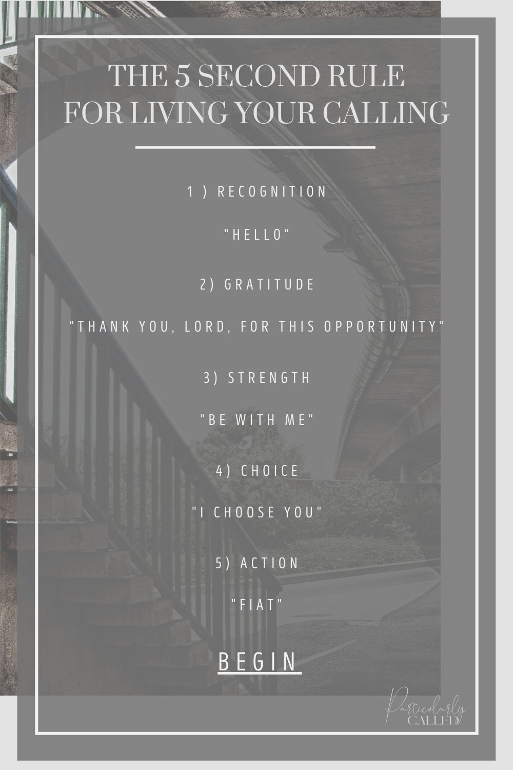 The Goal: Recognize that this is a moment where you need to use the 5 Second Rule. Typically, this looks like every time you are tempted to procrastinate something you know you are supposed to do – a strong and deep connection with heart, gut, and conscience are extremely helpful here. Acknowledge that this is a calling and a new opportunity to grow. Welcome the opportunity by giving it a positive perspective.